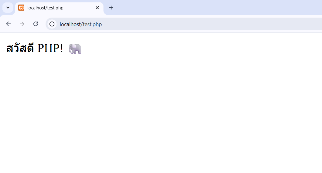 4. เปิดเบราว์เซอร์แล้วพิมพ์ http://localhost/test.php ถ้าขึ้นข้อความ “สวัสดี PHP! 🐘” — แปลว่าพร้อมเขียนเว็บแล้ว 💫